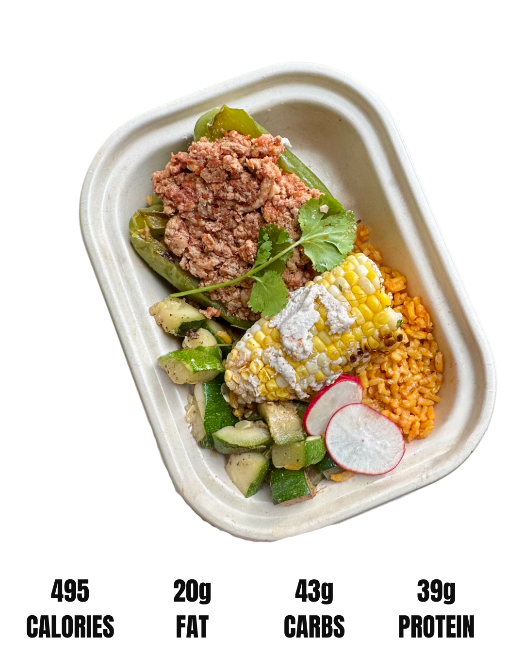Flame-roasted bell pepper, stuffed with organic ground turkey. Paired with a garlic zucchini sauté, elote-style corn on the cob topped with lime crema and cotija, served over mexican rice. Finished with sliced radish for a fresh, powerful crunch.
